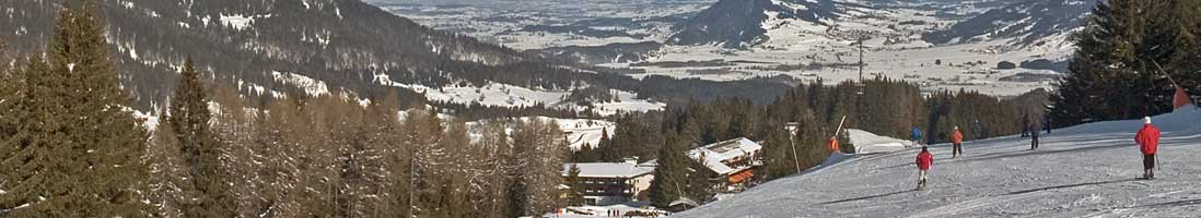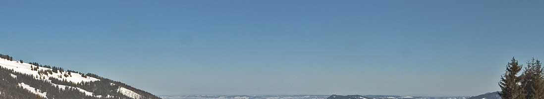 Beschreibung: der Blick reicht die Skipiste hinab zum Hotel Allgäuer Berghof, von dort dann weiter über den Grünten ins flache Allgäu